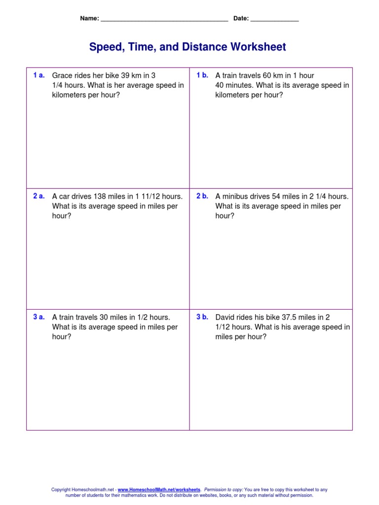 Speed, Distance, and Time Worksheets - Math Worksheets 4 Kids Speed, Distance, and Time Speed, Distance, and Time Worksheets Pacy and fun, our pdf speed, distance, and time worksheets ensure children in grade 6, grade 7, and grade 8 have what it takes to remain well ahead of their peers! Let them use the given measures and apply the correct formula to obtain the unknown measure.